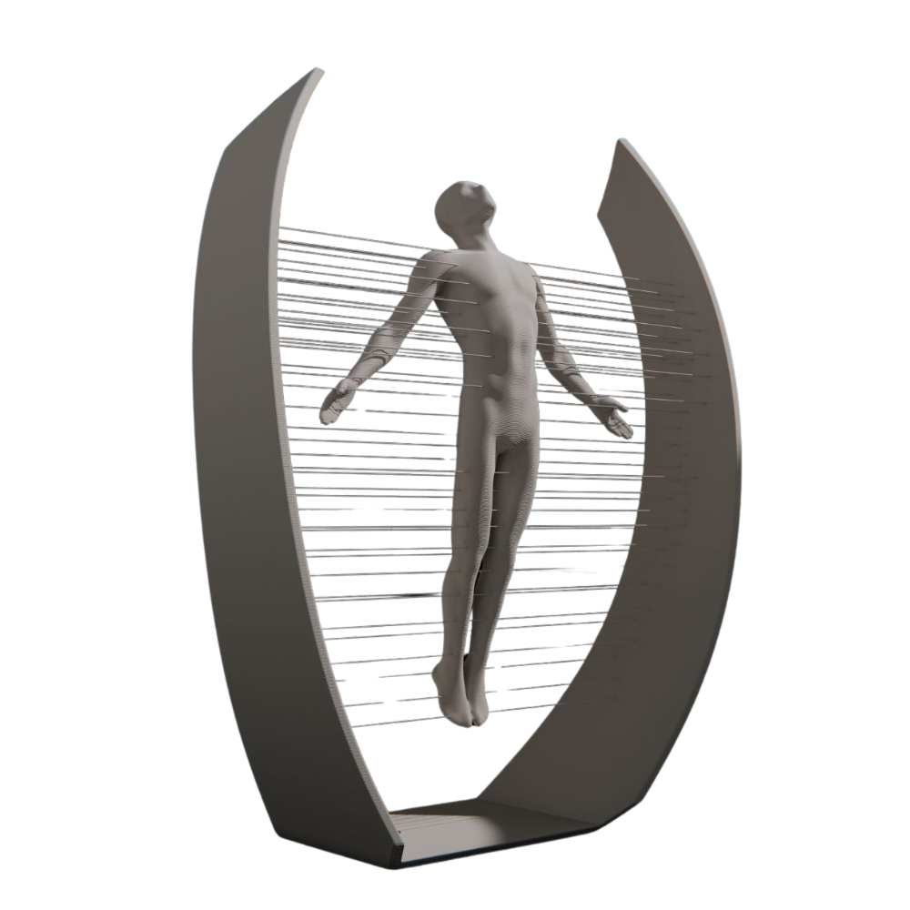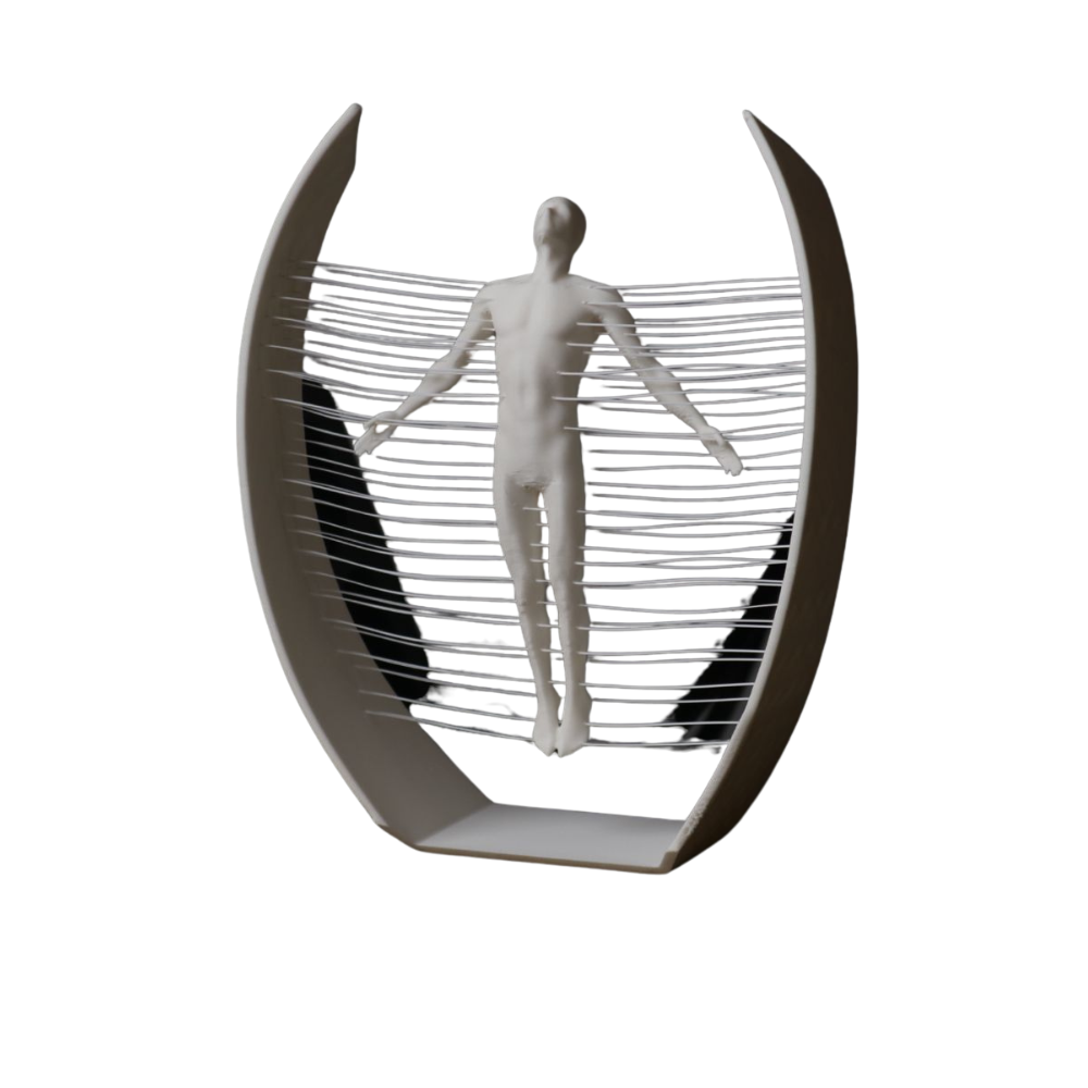 Product Description: This 3D printed abstract art piece showcases a human figure suspended within a sleek black frame, held together by intricate horizontal lines. Designed with a futuristic and minimalistic aesthetic, it serves as a bold statement piece for modern interiors, offices, and art collectors. Its unique form represents freedom, strength, and creativity—making it both a décor centerpiece and a conversation starter.