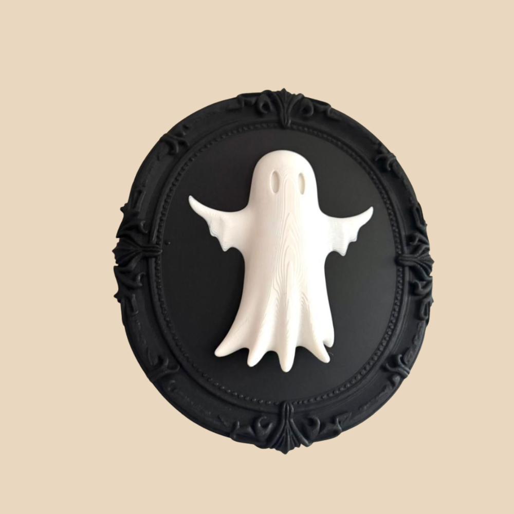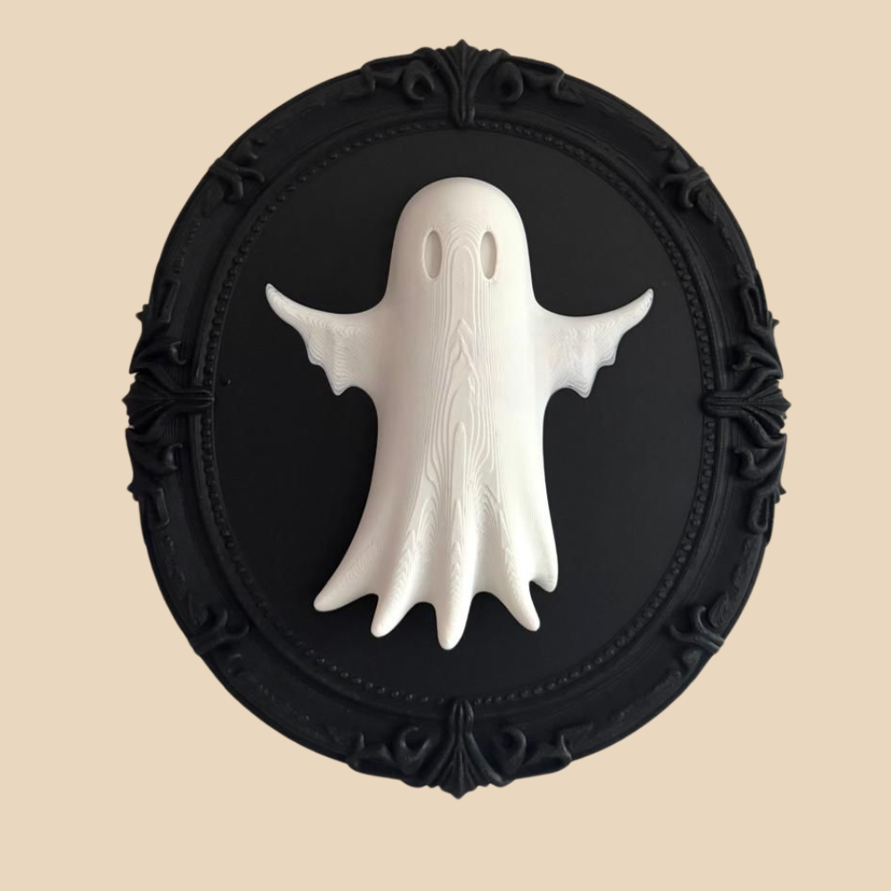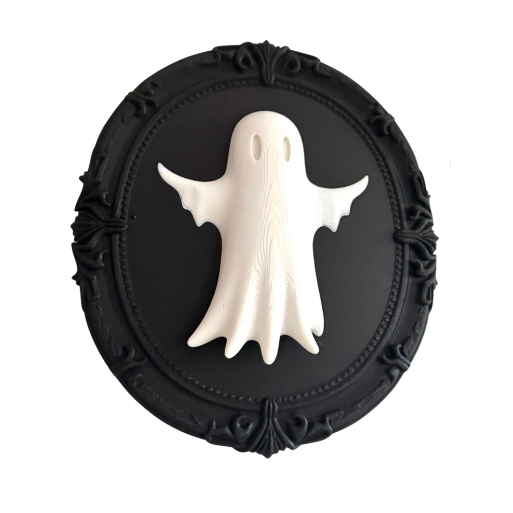 Bring a spooky yet stylish touch to your home with this 3D printed ghost wall art. Designed with a cute ghost figure mounted on a gothic-style oval frame, this piece is perfect for Halloween décor or as a year-round statement for gothic and quirky interiors. Made with high-quality PLA filament, it is lightweight, durable, and easy to hang.