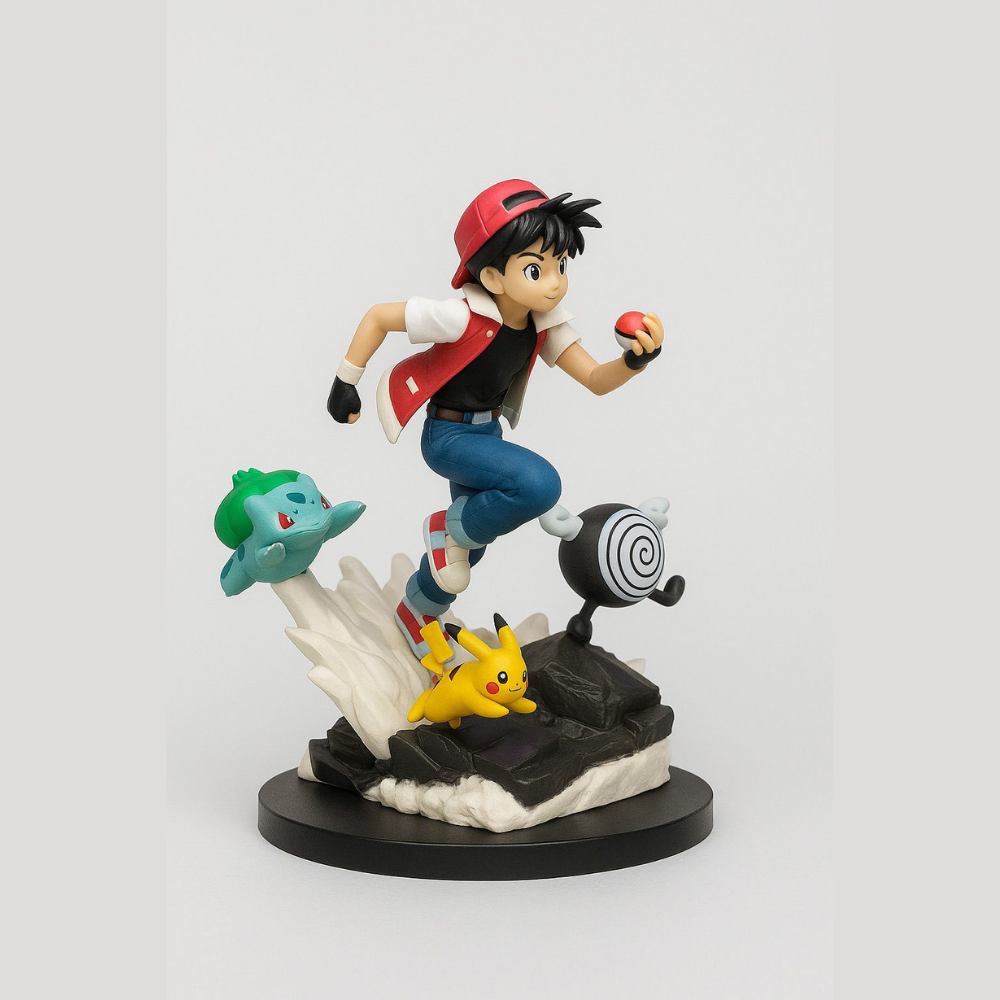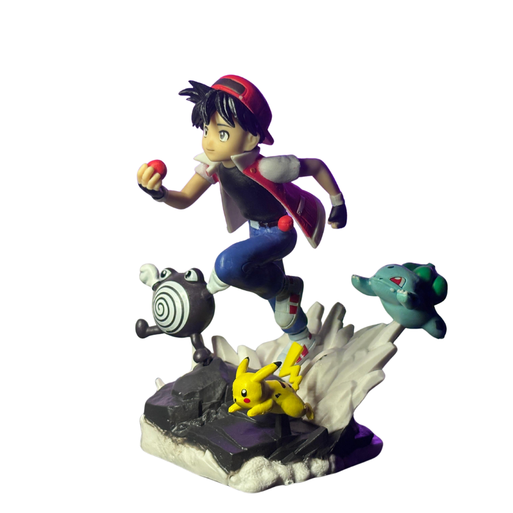 Capture the spirit of adventure with this Ash with Pikachu, Bulbasaur & Polliwog Collectible Figure, featuring Red alongside his loyal Pokémon companions — Pikachu, Bulbasaur, and Polliwog. Crafted with attention to detail, this dynamic figure showcases Red in a running pose, holding a Poké Ball, while his Pokémon leap into action around him. Made from high-quality PVC material, it’s a must-have for any Pokémon fan or collector, perfect for display on a desk, shelf, or showcase.