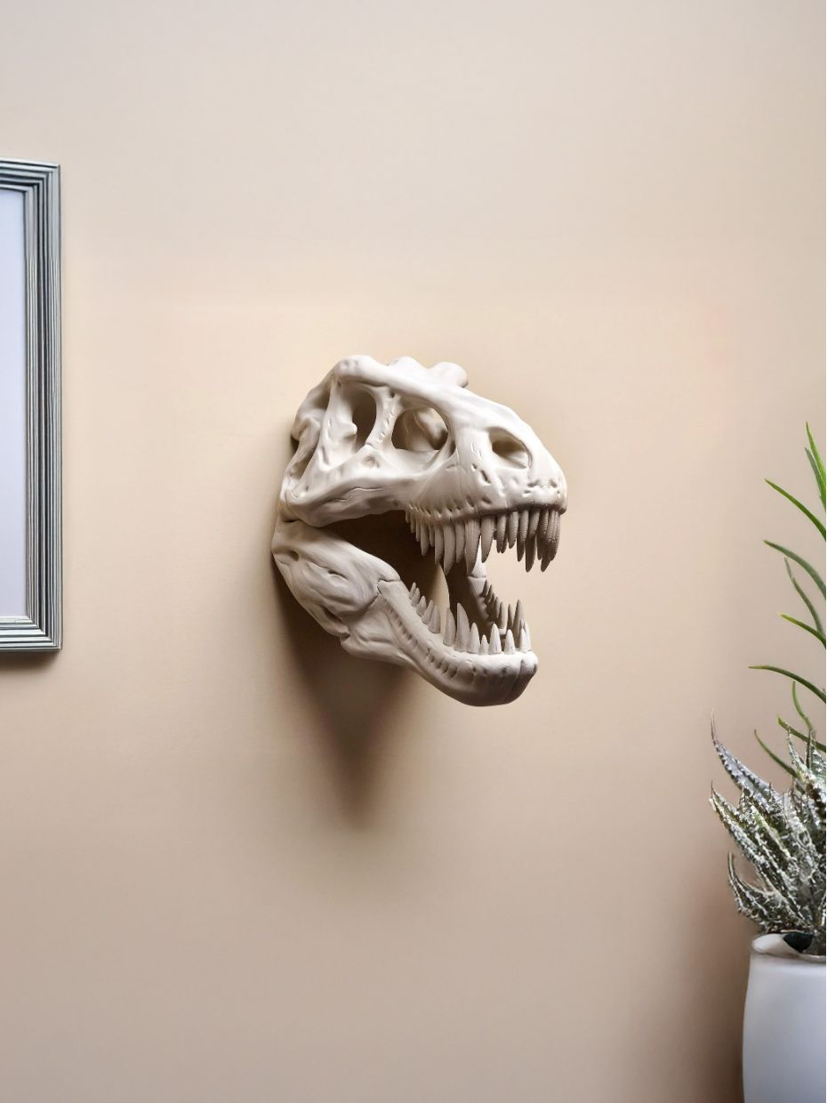 Bring the raw power of the Cretaceous period into your modern living space with our Jurassic Echo T-Rex Skull Trophy. This isn’t just a flat print; it is a high-definition 3D sculpture featuring intricate bone textures, deep crevices, and a fierce silhouette that commands attention.