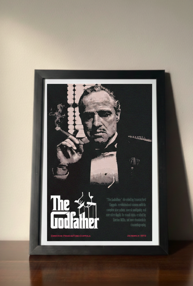 Bring legendary cinema to your wall with this premium metal poster inspired by The Godfather. Featuring an iconic portrait-style artwork of Don Corleone in a vintage halftone design, this poster perfectly captures the dark, classy, and powerful essence of the film.